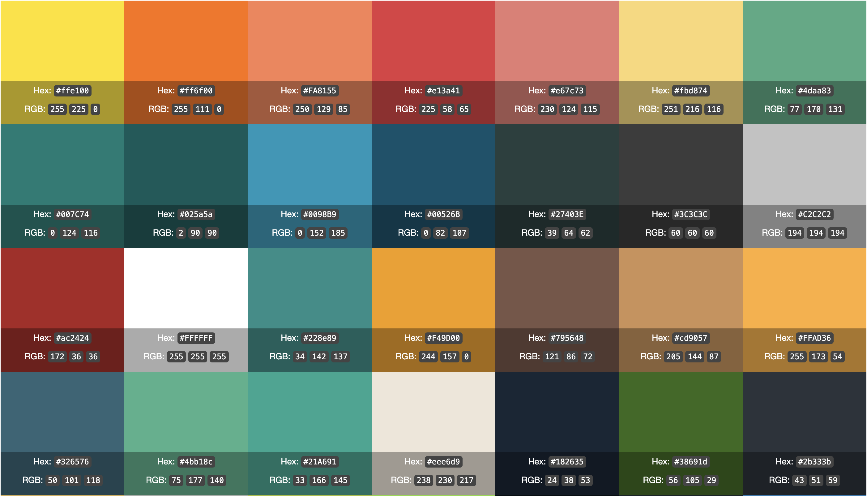 #025a5a - #c34e56 - #4daa83 - #2787c3 - #ff6f00 - #C2C2C2